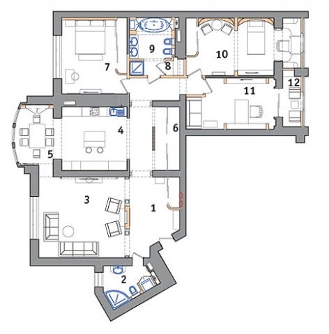 Перепланировка Вместо стен с маленьким проемом для двери возведены высокие, просторные арочные проемы в лепном декоре. В детской и кухне присоединены балконы: детская получилась с игровой, рабочей и зоной отдыха, а просторная кухнястоловая. В кабинете за стеклянной раздвижной дверью удалось выделить кальянную. Увеличение санузла позволило разместить домашнюю сауну. Объединение аркой с колоннами холла и гостиной добавили легкость в визуальном восприятии и естественной освещенности холлу.