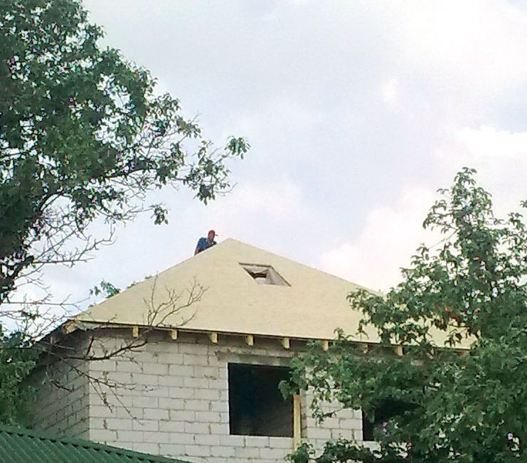 При  выборе конструкции крыши хозяева решили установить простую, без    изломов, чердачную конструкцию. Такая крыша несложна в монтаже,    долговечна, надежна и не требует особых затрат. Выбранная в качестве    кровельного материала битумная черепица (стекловолоконный материал,    пропитанный битумом) экономична, технологична, хорошо укладывается,    легка, не подвержена коррозии, бесшумна во время эксплуатации (не шумит    во время дождя) и отлично выглядит на крыше.