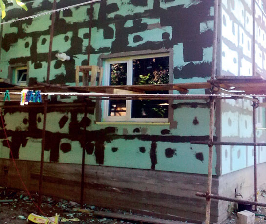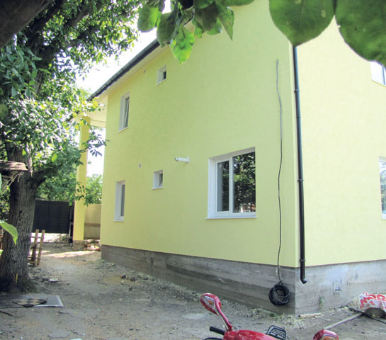 Выбранный  стеновой материал — газобетонные блоки — оказался весьма   технологичен  и удобен в работе. Благодаря большим размерам (один блок   эквивалентен  десяти кирпичам) и сравнительно небольшому весу, кладка   стен  выполнялась быстро: их возвели менее чем за один месяц. Газобетон    легко обрабатывать, поэтому на отделку ушло сравнительно немного сил и    времени. Правда, несмотря на хорошие теплоизоляционные свойства    газобетона будущие хозяева все же решили выполнить наружное утепление    фасада, применив для этого в качестве утеплителя экструдированный    пенополистирол. Для финишной облицовки фасада использована декоративная    штукатурка типа «короед» на белом цементе. Это штукатурка для наружных  и   внутренних работ с добавлением минеральной крошки (фракция 2...2,5    мм). Наносится очень легко и отлично смотрится на фасаде.