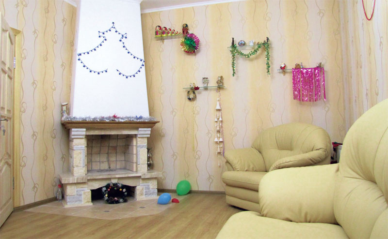 Оформляя  интерьер дома, хозяйка стремилась создать уютное для жизни и   отдыха  пространство. Отличительная черта каждого помещения — цвет. В   гостиной  доминируют светлые бежевые оттенки. В этом помещении много   света как  локального (центральная люстра), так и зонального — в виде бра   у  дивана и подсветки над камином.