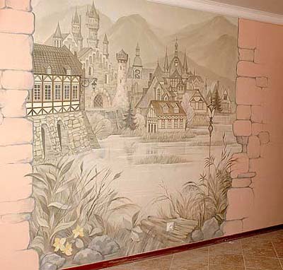 Идем дальше. Итак, поверхность есть. Теперь на стену надо нанести рисунок, тут можно смотреть, если производится роспись стен в детской комнате, то рисунок должен быть,конечно, детский, а если это спальня или гостиная, то будет уместна роспись стен - сакура в японском стиле. Вы делаете рисунок на бумаге и потом, увеличив его в масштабе, наносите контуры на стену, но можно упростить задачу. Выберете слайд с понравившейся композицией, с помощью проектора проецируете изображение и обводите контуры карандашом. Теперь начинается самое интересное - роспись стен в интерьере своими руками. Краска наносится кистями с натуральной щетиной, сначала делается фон, а потом прорисовываются все остальные детали. После того как роспись стен - ветка дерева и все остальное закончены, даем краске хорошо высохнуть и покрываем весь «холст» акриловым лаком для защиты от повреждений и воздействия атмосферного воздуха. После того как лак высохнет картину полируют сухой кистью. Все,роспись готова и будет радовать Вас и гостей своей неповторимостью и оригинальностью.