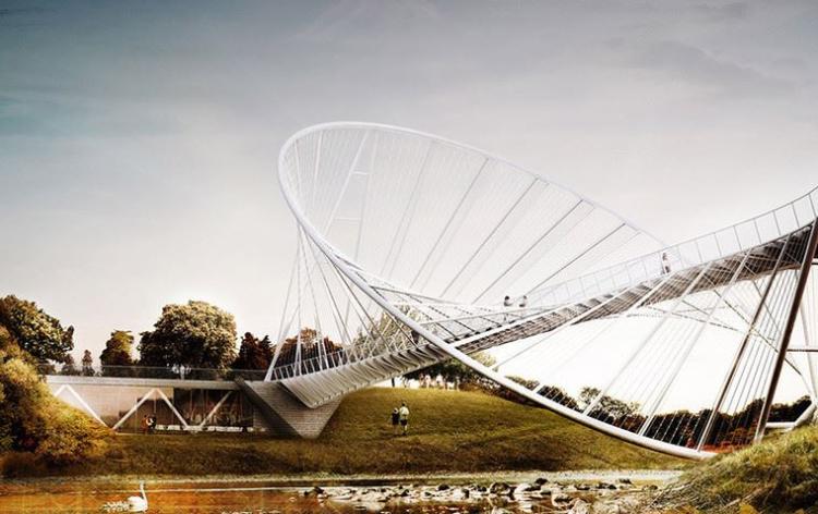 На международном конкурсе Salford Meadows Bridge Competition два молодых архитектора Крис Прехт и Алекс Даксбек представили свой инновационный проект пешеходного моста через реку Ирвел, что в Солфорде, Великобритания. Организатором ежегодного конкурса является компания RIBA (Royal Institute of British Architects), целью которого в этом году она поставила создание нового проекта моста для соединения Солфордских лугов и делового центра в районе береговой линии.